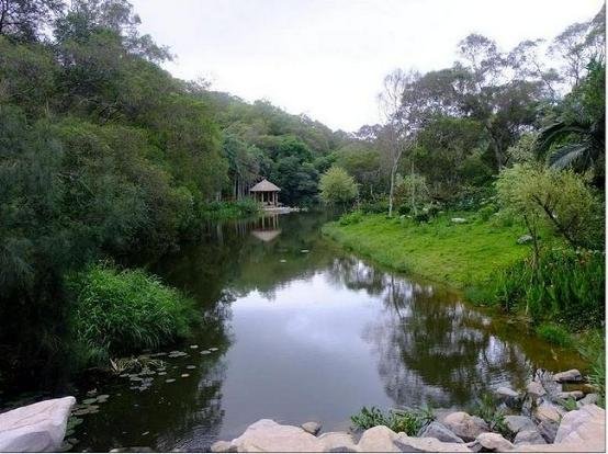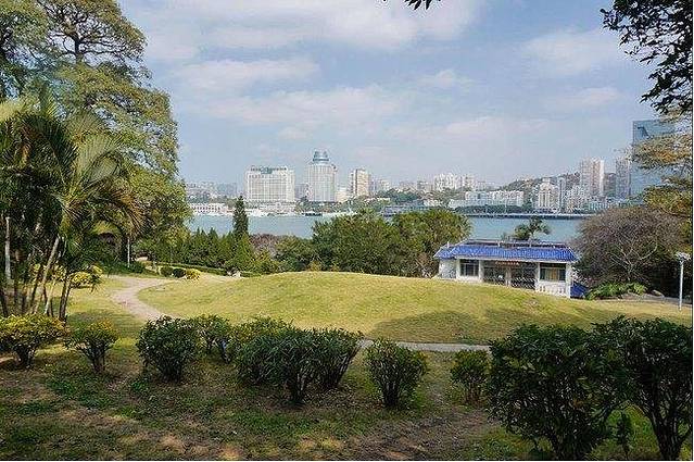 一座私人园林,有《红楼梦》怡红院的建筑风格,设计极其巧妙,利用天然地势,依山建宅,错落有序,巧为布局,动中有静,静中有动,把海湾里的礁石,涨落的海水全部利用起来,使原本十分狭窄的一个小海湾变成了视野宽广的海上花园。