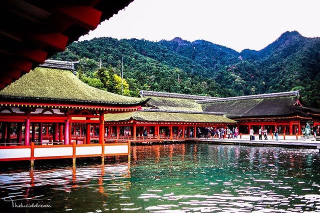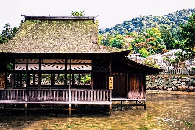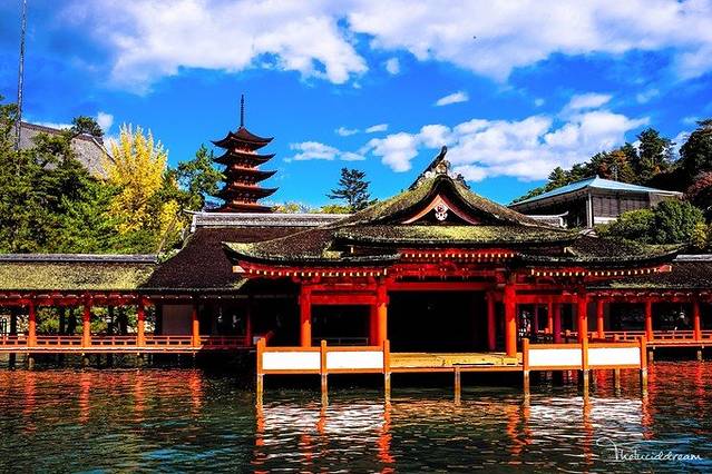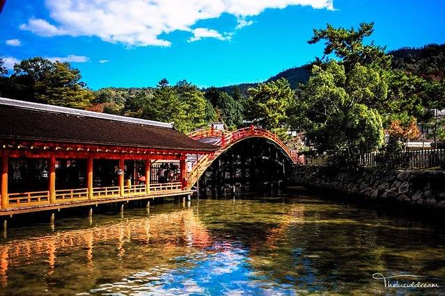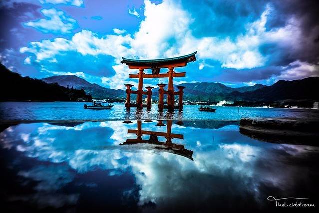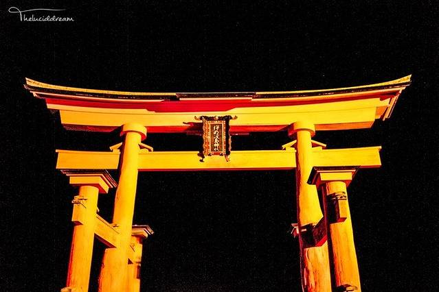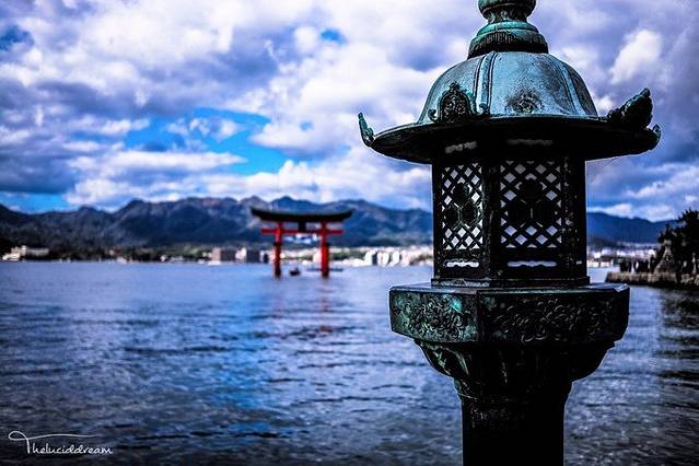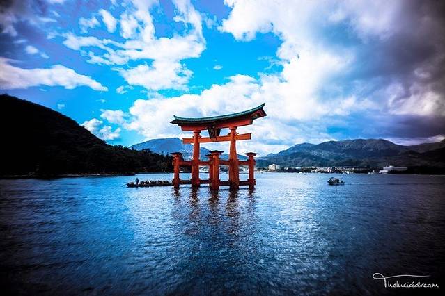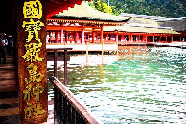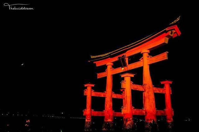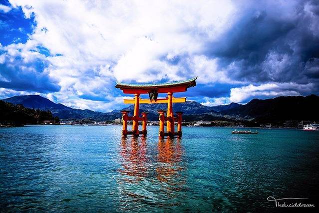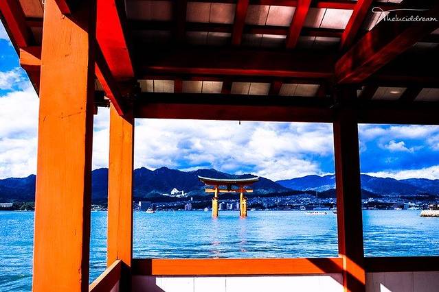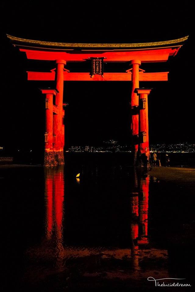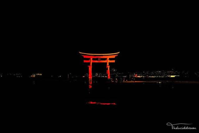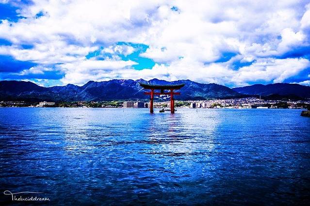 (矗立于海中的巨大红色鸟居,与松岛及天桥立并称“日本三景”。与对面的严岛神社一起修建于海岸附近的浅滩之上,退潮时可以沙地与本岛连接,涨潮时则需乘船接近。)