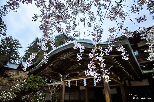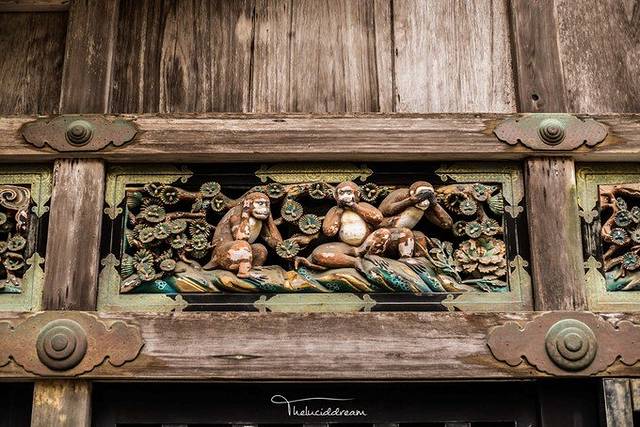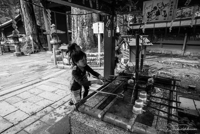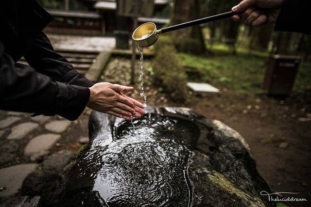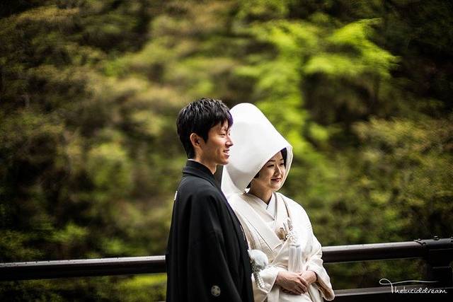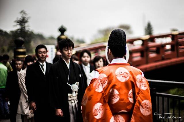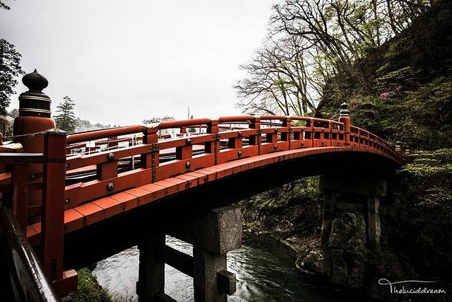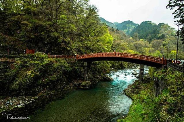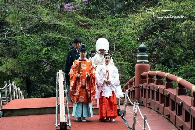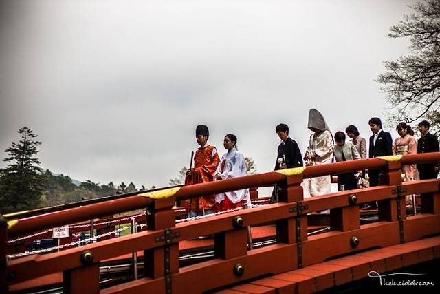 神桥。坐落于日光山的入口处,是日本三大奇桥。横跨大谷川的朱红色神桥,传说中是神仙为帮助在日光开山的胜道上人,用神社帮助他渡河所形成的桥。记载中最初是以吊桥形式于1486年修建。明治35年(1902年)被洪水冲垮,后重建,现今归二荒山神社所有,是重要的文化遗产。图中是一场日本传统婚礼,新人向神祈祷后跟随神官跨过神桥,仪式庄严。