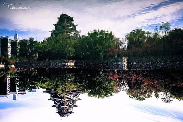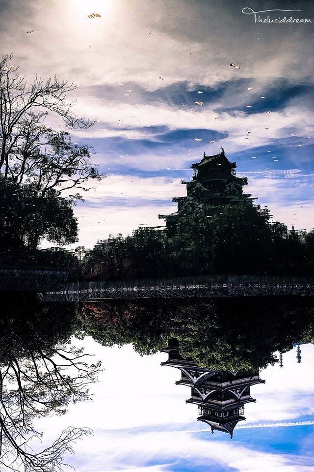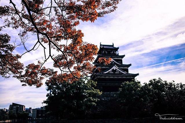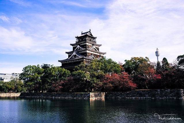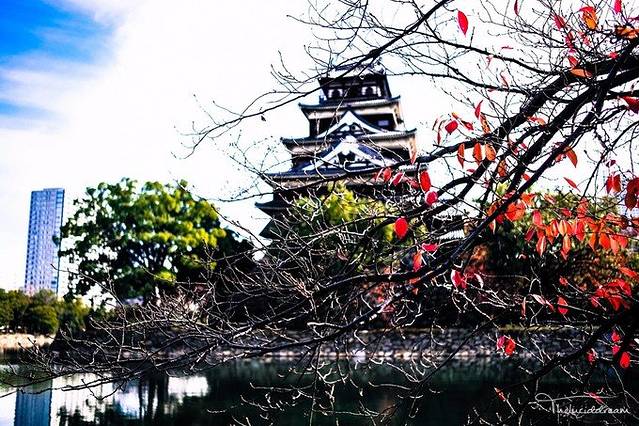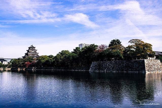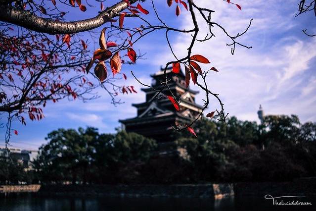 你拖慢脚步走在护城河边。秋天熟透了,你甚至能用舌尖尝到金色的味道。觅食的鸽子、散步的狗、嬉笑的孩子们。广岛城天守阁的倒影在河面上轻轻打起瞌睡来。