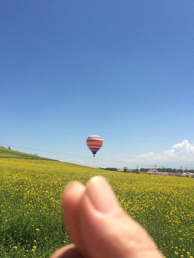 这是我们3天行程的最后一站。这里需要先乘一段电瓶车到达景点,再沿步道登上山顶。8月1日已经不是油菜花开最美的时节了,但还是很壮观。黄绿相间,也是很美的。这里的油菜花田超大,登高观花,非常壮观。蓝天和变幻着不同形状的白云、黄绿相间的大片花田、远处的色彩鲜艳的热气球...,怎一个“美”字了得!