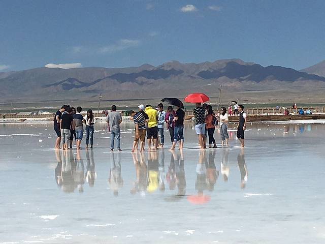 早上7点在西宁公园乘车,大巴很高大,有点像双层BUS!我们最晚上车,坐最后一排。一路途经日月山(从车上望望前面的两个山头,导游讲了故事)、倒淌河(因从东到西流)到中午1点左右我们抵达茶卡镇。午餐后我们就去了号称可供全国人民吃75年的——茶卡盐湖。因为周末、因为正好是旅游旺季,人超多!