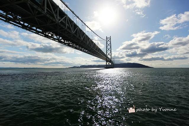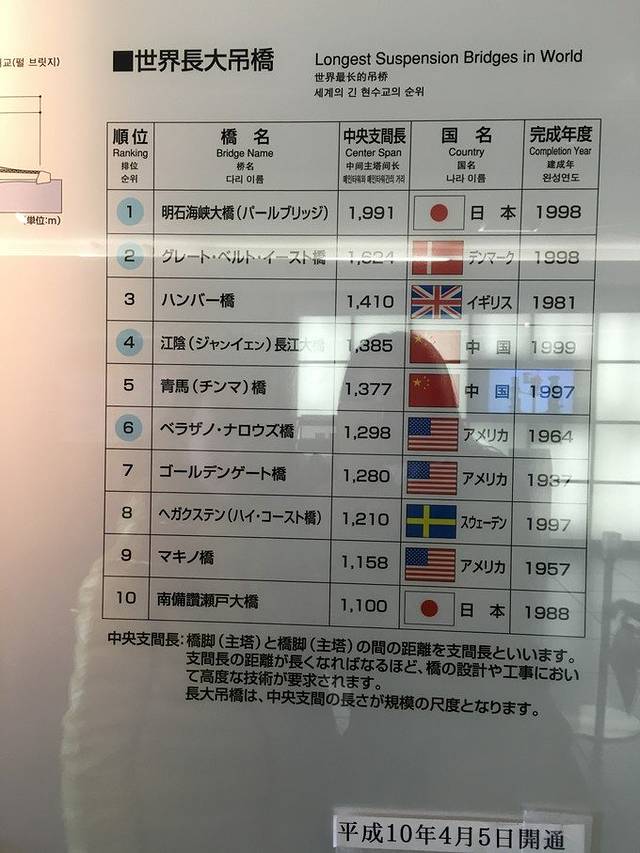 明石海峡大桥:位于日本本州与四国之间,连接日本神户和淡路岛之间跨海公路大桥,它跨越明石海峡,总长度3911米,是目前世界上跨距最大的桥梁及悬索桥。