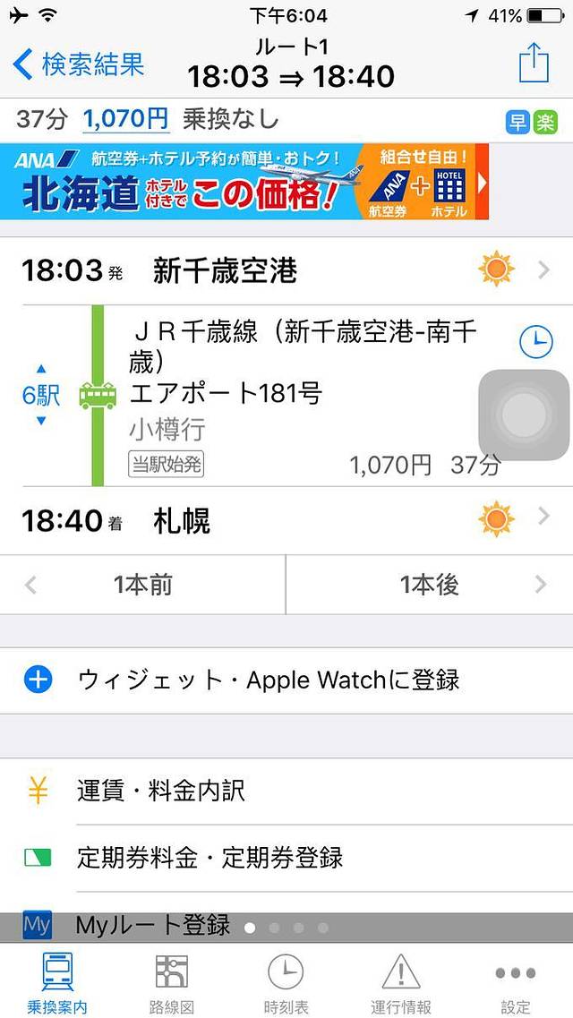 酒店–新千岁 「快速Airport号」36分钟 普通自由席1070日元 8:40-9:20