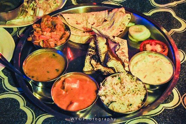 钟楼离火车站不远,tutu车80Rs被坑了。火车站对面有个LP上推荐的餐厅,很高级的样子我们点了2个菜,一壶masala tea,一盆白米饭,一共吃了1200Rs,最贵的一顿饭。点的黄油鸡,问我们是不辣 微辣 还是辣,我们说微辣,结果菜端上后,我们都迫不及待的吃了第一口, 嗯~味道真好,就是有点辣,继续吃了几口,简直辣的冒烟,连服务员都看得出我们被辣的不行,上来询问是否需要重新给我们加工一下。我们一惊,这种curry糊糊还能回锅重新烧啊,但同时头点的跟拨浪鼓似的回答:要!
