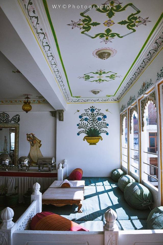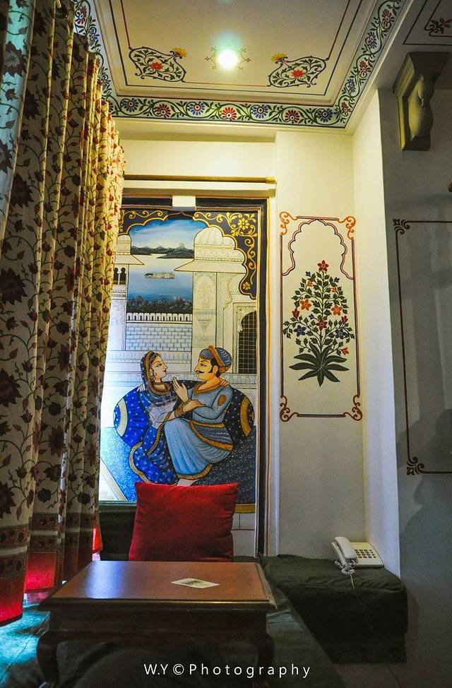 【乌代布尔】Mewar Haveli,3600Rs2晚(死命砍的价格)。综合评价8分。Address:34-35 Lal Ghat。楼顶餐厅价格较贵,但是可以看见湖,风景不错。房间布置的也很有印度古代特色,空调电视机都能正常使用,洗澡水超大超热,24小时有。离城市宫殿很近。
