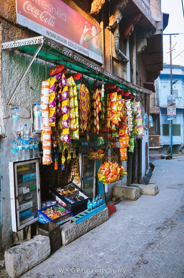 印度基本找不到超市,一般就这种小卖部,篮子里的红包装的番茄味薯片超级好吃,只要10Rs一包,比乐事好吃百倍,我们一下买10包,一边晃一边吃,感觉好满足啊!就在乌代布尔和焦特布尔有卖,之后就再也找不到一模一样的了