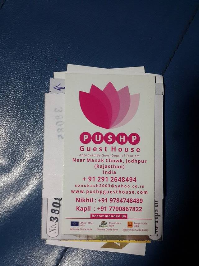 【焦特布尔】Pushp Guest House,800Rs一晚,综合评价6分。老板娘烧的菜很好吃,楼顶餐厅可以看见古堡,欧美人住的比较多,房间比较简单,三个人住比较挤,洗澡水不热。