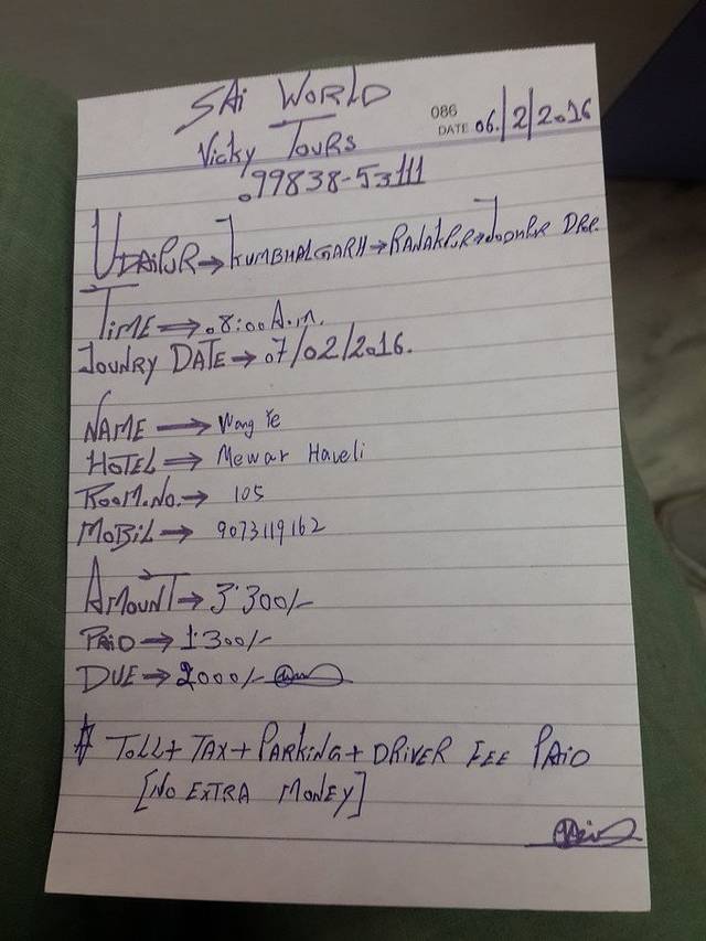 包车去贡布尔加尔长城和千柱庙再送到焦特布尔,3300Rs一车(含所有价格),砍不了更低的价了,1300Rs预付给代理,2000Rs到了焦特布尔付给司机。估计河对面找代理会便宜一点,从焦特布尔反过来到乌代布尔也便宜,看见门口大多数开价都只要2000Rs一车。