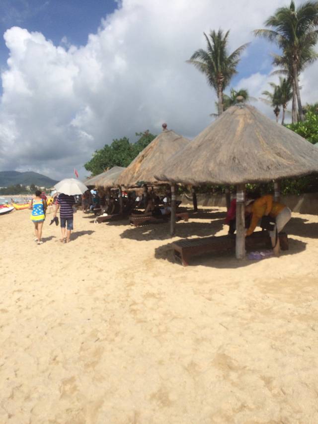 我们去的早,占上了免费提供的伞蓬和躺椅,软软的沙子,特别细,踩上去很舒服,排水很清澈,就是海浪稍大,带娃游泳最好给带上泳镜