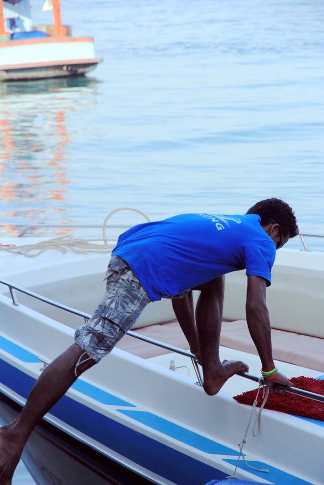 接下来的行程,我们都会依靠这个快艇,把我们从不同的小岛和浮浅点,载来载去,快艇上会有一个专门服务整条船的导游,我们的导游人很NICE,但就是一个这么好的人,我竟然都没想到拍一下他,好惭愧。在码头等人的时候,会有小饼干,水之类的服务肚子依旧很饿的人,然后导游会在上船前,派发晕船药。