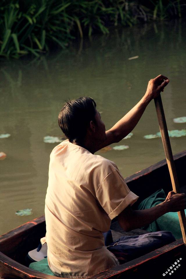 闲暇午后,一条小船,荷花池中,金色湖面,荡漾。
