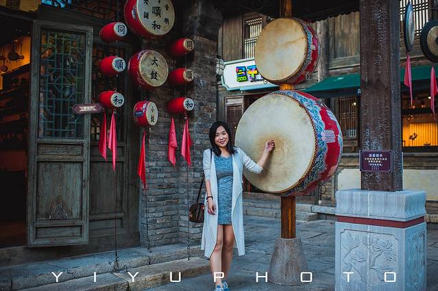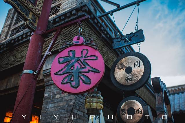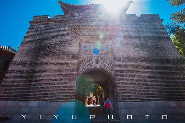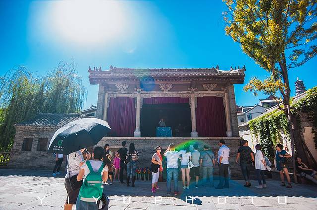 在景区的中间地带日月岛广场处,景点和餐厅非常丰富,中心大广场两端是老戏台和城门,上午的太阳很足,广场周边都是乘凉的人。