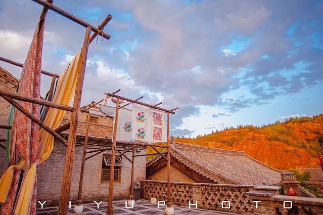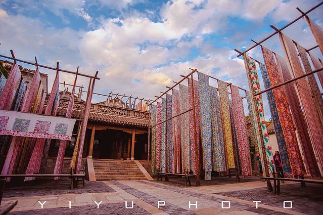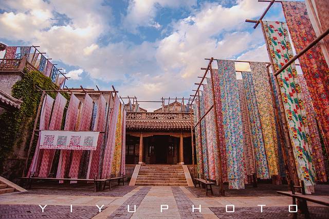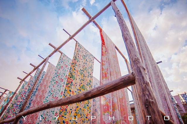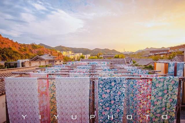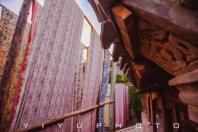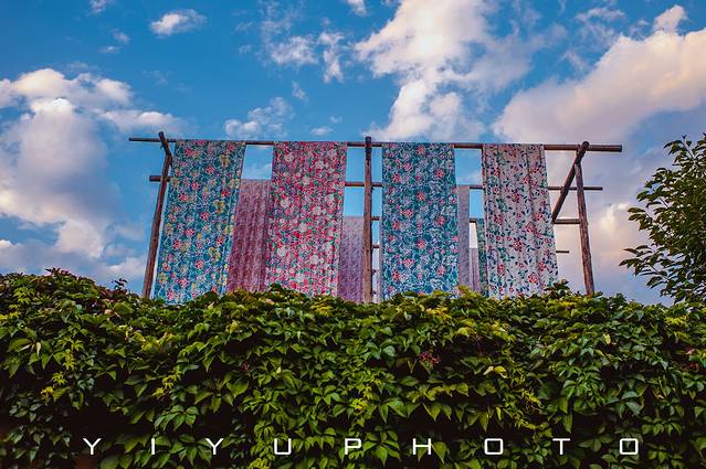 “永顺染,草木色,手工缬,天然彩”。观赏原汁原味的生态印染。老师手把手教你DIY属于自己的印染作品。因为是傍晚来到这里,DIY的项目已经结束了,正是傍晚彩霞染红了天色,蓝天白云衬上染坊的花布格外迷人