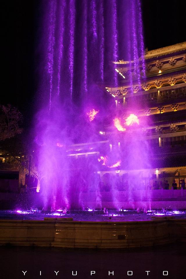 喷泉节目开始,好几首曲子效果不同,大多慷慨激昂让人听了觉得非常激动,不同效果的喷法结合音乐灯光形成令人目眩的效果,更值得称奇的是运用了火焰,火水气光、美仑美奂