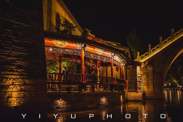 经验丰富的船夫让我们分别坐在船的两侧,穿好救生衣,坐稳扶好,不能随意站起和把相机深处船外,叮嘱一番后,就开船了。凉风袭来,水面好宁静,灯光映衬的建筑比百天更为秀丽。不愧是北方水乡。温柔的微风,秋夜朦胧的月亮,还有微微摇动船晃出的涟漪,都无法记录在这定格的画面,却深深地印在美好的回忆里。中秋赏月,别有一番独特体验。