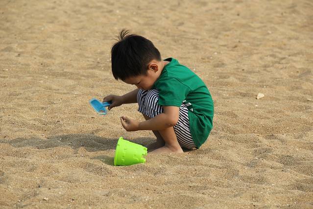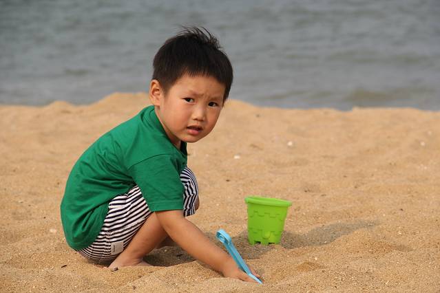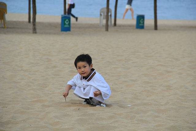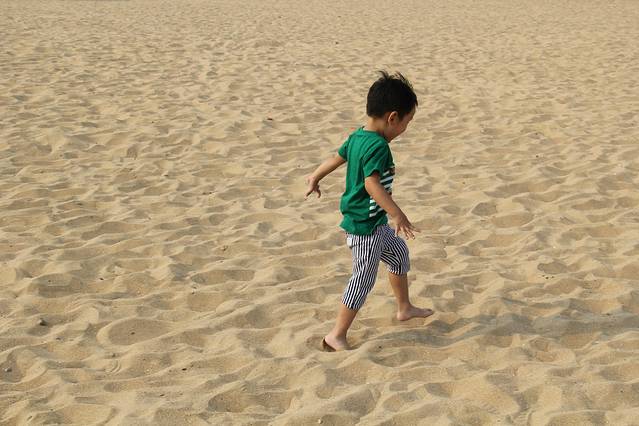 大沙湾浴场,孩子看见沙滩兴奋的不得了,让他玩一整天沙子也不会腻的。