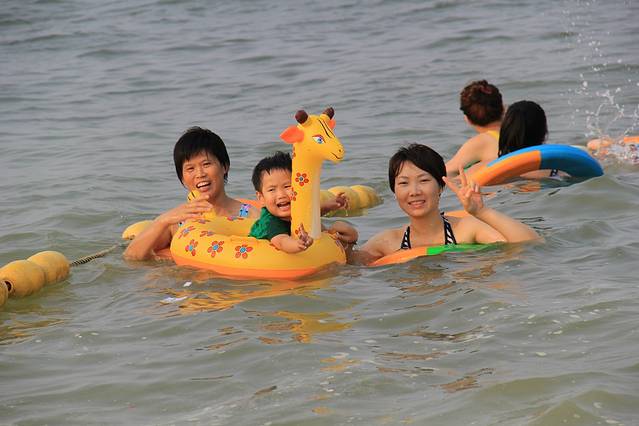 秋天的海风很凉爽,但是泡在海水里是一点也不冷的。浴场的游泳圈是免费提供的,套上泳圈在海里飘着,伴着海浪,随波逐流,放空一切,没有烦恼,只有欢声笑语。。。。。。