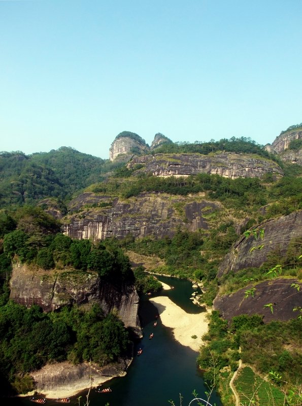 第二天早上导游来接我们,出发去天游峰。进入景区要坐小火车,好几个颜色,像儿童乐园的火车很好玩。老爸恐高 ,所以天游没上去,我和妈妈上了一段,从山上看九曲溪像一条碧玉腰带,真心漂亮。虽然才11月,但可能在山区吧,出着太阳气温也是有点低,尤其是在水上漂流的时候。船工都练得口才不错,一路会讲解。我们那个竹排的船工还讲了来武夷山拍过电影的明星是什么样的,吴彦祖啊、黄圣依啊,哈,当八卦听了。朱熹讲过学的书院也可以进去看看,虽然他的理论我并不认同。