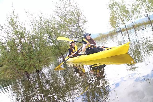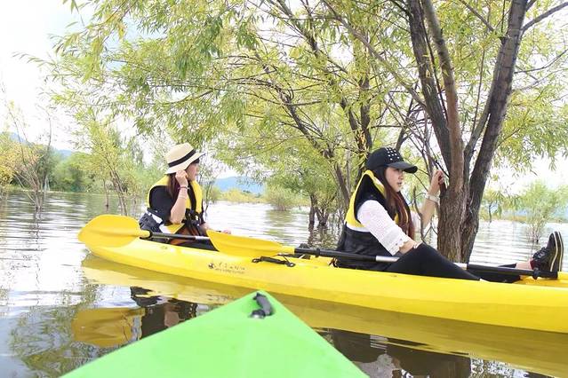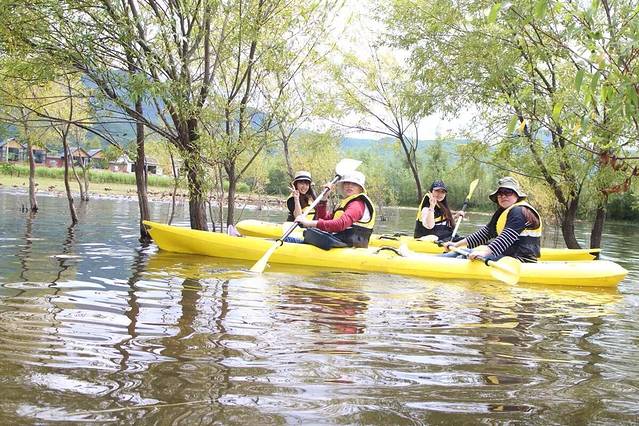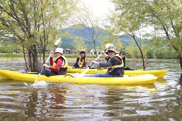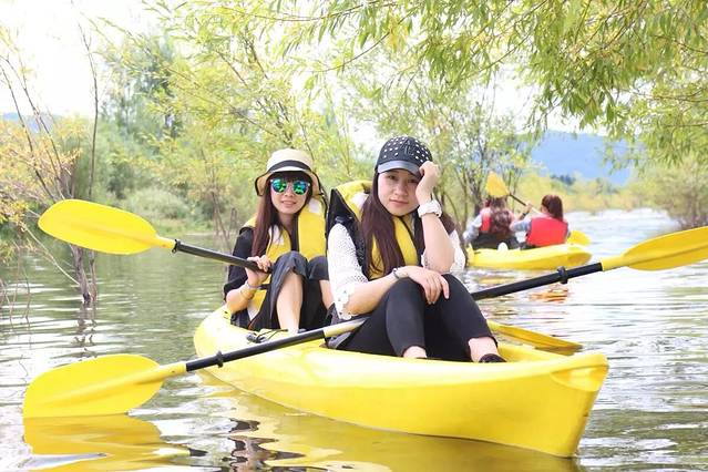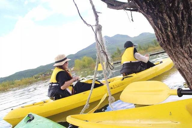 吃完饭就去划船了,就在吃饭的附近不远,走路几分钟就到了。我们五个人,两个两个一条船,一个一个人一条船,还没划的时候很怕,因为没划过也不会游泳也不知道水的深浅,但是真正划了也就那么回事,没想象中的恐怖,水也浅,景色还很漂亮