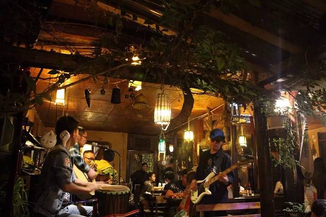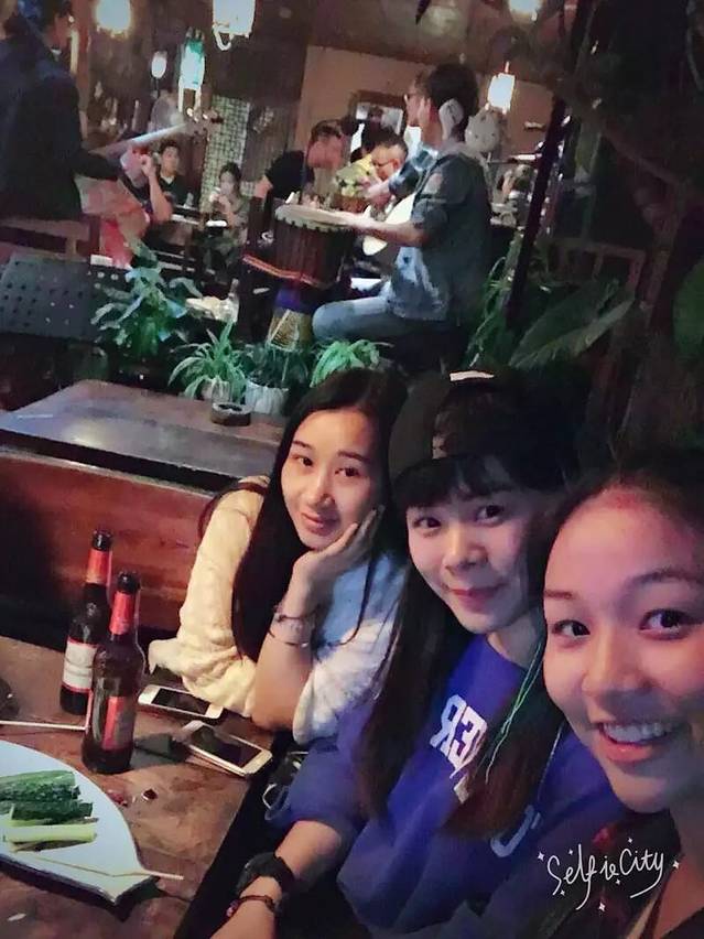 晚上再逛了一下古城就去了民谣清吧,帅哥唱歌都很好听,我们点了一些小吃和半打啤酒,因为不是每个人都能喝,老板说给我们这帮学生打个折,所以我们五个女孩子,一个男孩子才花了两百多而已,还是刷脸的世界啊,😄