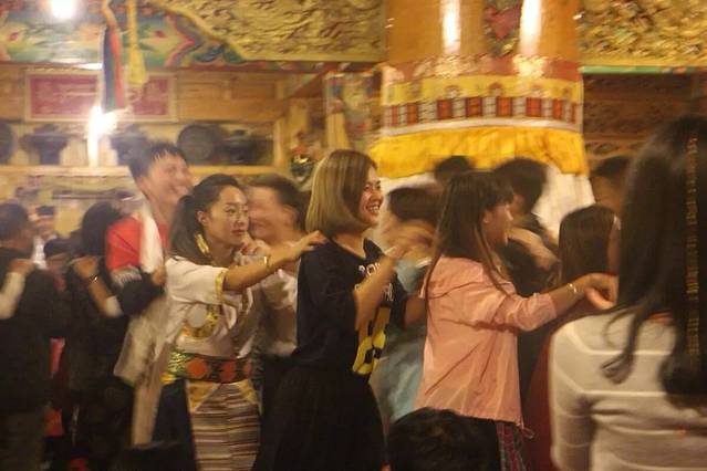 逛到下午五点多就打道回府了,直奔我们晚上要住的酒店放行李然后去藏族家访,晚上看节目表演,觉得他们都很热情,气氛把大家都感染了,跟着一起跳舞,吃的就一般了,什么烤鸡烤羊肉的,有碗汤,还有个什么面粉要自己动手和的,他们藏族吃的一种,我们也就做个样子,入乡随俗而已,尝了一口就没吃了,实在吃不习惯