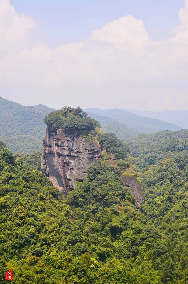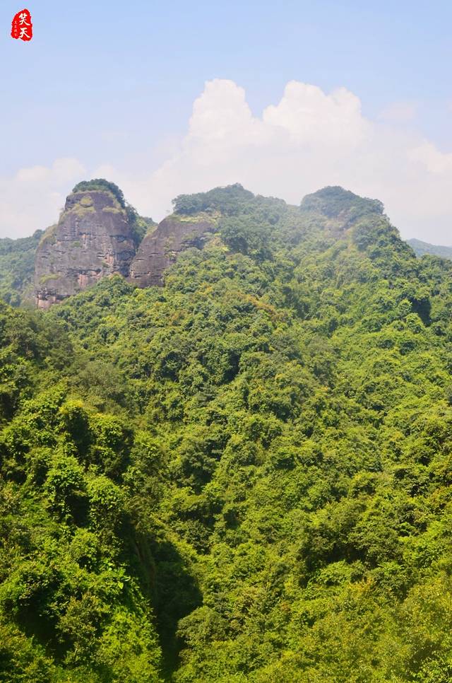 最形象的要数“五指石”了,景区正以此命名。这处位于梅州平远、被称作“广东四大丹霞”的地方,一直很低调,因而也不特别知名;其实,单单比较其名与实,即可验其低调。五指石?我看称其为“五指峰”更恰当:草木繁茂以覆的五座山峰,最右者显见粗壮得多,好像大拇指;其他错落,高低虽与手掌参差不可严加比对,然近似如此,以五指形容,已是相当形象了。