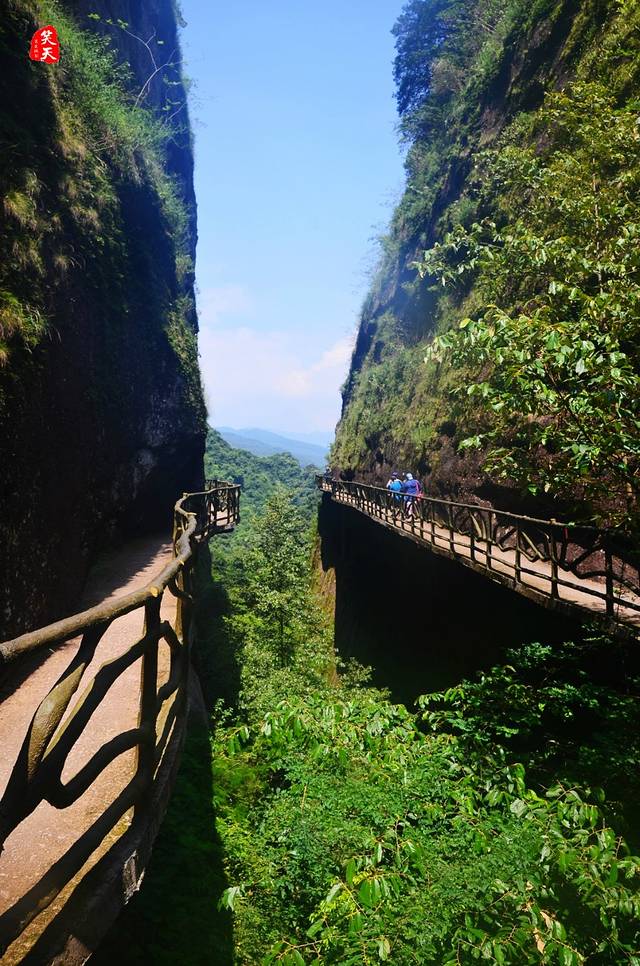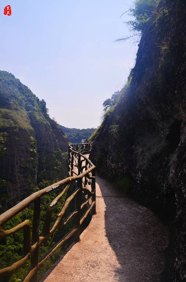 初登之前,并非门开敞阔的景,却是闻着青苔气息,踏圆木穿过山壁相对的窄道,然后豁然开朗、台阶以现,颇有“武陵源”之态。山不在高,很快我们即行走临渊栈道之上,赏绿意波澜,观奇峰异景。