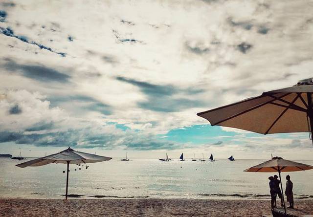飞机延迟1个多小时起飞,到了Kalibo国际机场将近12点了(长滩岛和中国没有时差)。对,这个标榜着“国际”二字的机场,居然只有一个行李传送带,四五个过关柜台,没有厕所,没有空调,两台大型电风扇!少数机智的人已经在飞机上提前换好短袖短裤了,大部分人都还是裹着羽绒服大衣毛衣的呀,瞬间懵逼了好吗?!so many铝孩纸直接表演现场换装啊!也是异常艰辛。提行李、过安检、换钱(可以用人民币换)折腾了大概40分钟,终于出机场了。wow,眼光明媚,天空中飘着朵朵白云呀~心情也瞬间变好。
