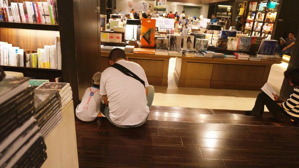 在诚品看书的感觉很奇妙,都是看得懂的繁体字,熟悉又陌生。有些书的书页都是从左往右翻页,并且是竖行排版,沿袭了中国古籍版式。书籍种类很多,眼花缭乱啊~~书店是木地板装潢,所以许多读者都席地而坐,尽情徜徉于书海。这里的读者从小童到花甲,不得不感慨台北浓厚的读书氛围。看,这对父子多有爱~~