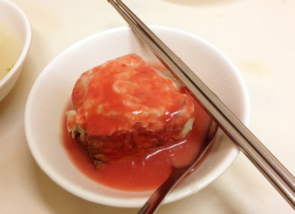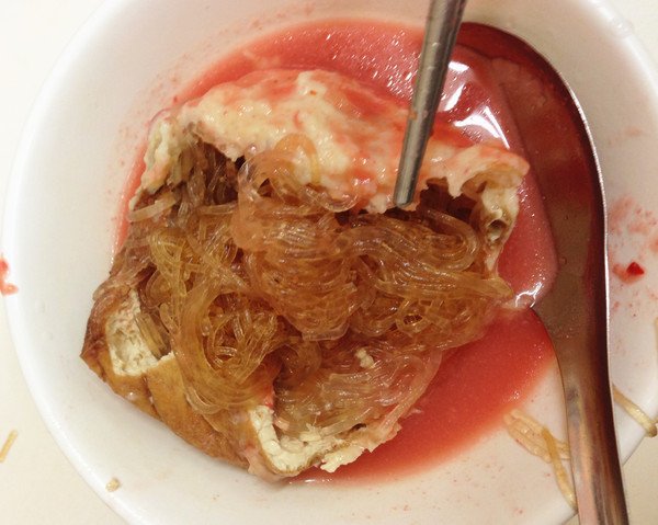 玩儿累了,赶紧回酒店,坐接驳车去老街觅食啦!淡水的老街,不像垦丁那么热闹,一副悠然自得。我们先尝了淡水特色小吃,阿给。它其实是日本油豆腐的音译,四方形的豆腐,中空,填入冬粉丝,用鱼浆封口蒸熟。淡水阿给店太多了,去前没有细究哪家才最正,看到老字号,就杀进去啦~!味道不错,可以尝尝,不过谈不上惊艳啦~