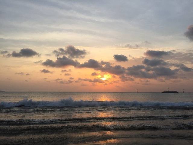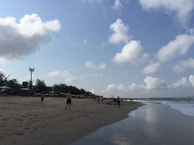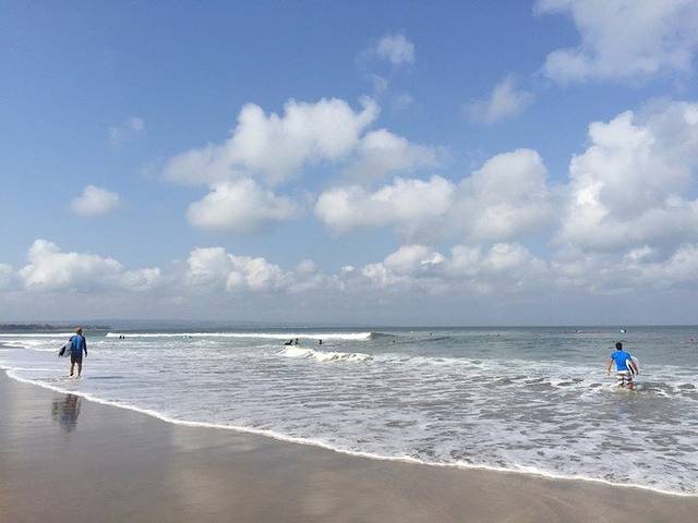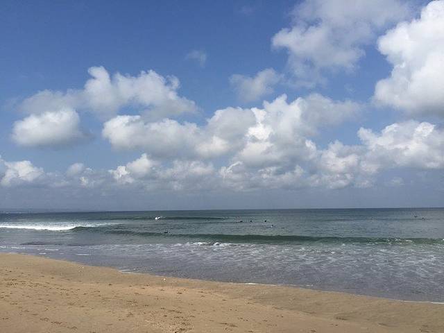 今天早晨要去蓝梦岛,下午蓝点。蓝梦岛的船票是从淘宝买的,包接送的。贴个网址给你们(https://items.alitrip.com/item.htm?id=44359415605&spm=a1z09.2.0.0.ZAVW8w&_u=ka1lsv8ff41),可以参考下,乘船的往返时间可以自己订。早晨等司机来接,抽空到库塔海滩(Kuta Beach)逛逛,听说这里是巴厘岛最适合冲浪的地方了。沙滩上有一排排的海滩椅,白天可以在这里戏水、晒太阳,就算只是坐在这里发呆,也是挺美好的。