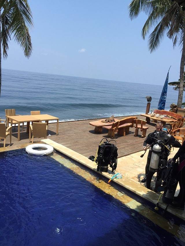 今天一天都是在图蓝本深潜,从淘宝上预订的,文章最前面有网址的。很多人说没有去过图兰奔,就不算到过巴厘岛,所以此行的重中之重就是到图兰奔潜水! 图兰奔是巴厘岛东北的一个海边小镇,被称为全世界最美的50个潜水胜地之一,最大的特色是海底一艘二战时期的沉船残骸(Liberty Wreck)。图兰奔的水流平缓,水质清澈,能见度很高。约400种鱼类以此为家,包括鲨鱼、龙头鹦哥、巨型石斑这些大家伙。