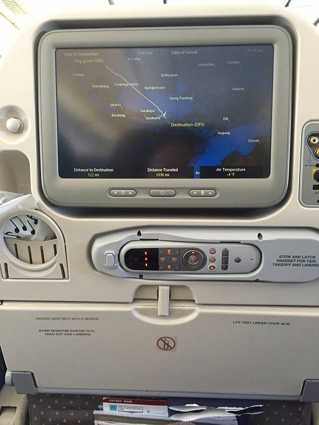 从新加坡到巴厘岛是新航执飞,座椅前面有小电视,可以看电影也可以玩游戏...太人性化了。还可以给手机充电的,不过记得要关机哈。