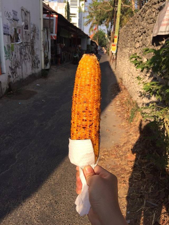 这里的烤玉米,我喜欢吃甜辣味的。10000印尼盾一个。