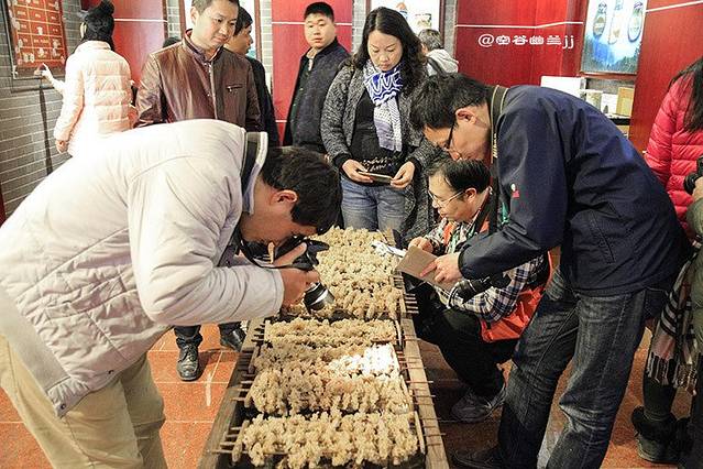验客们在裕德源土特产销售中心拍摄烤制银耳的展示。