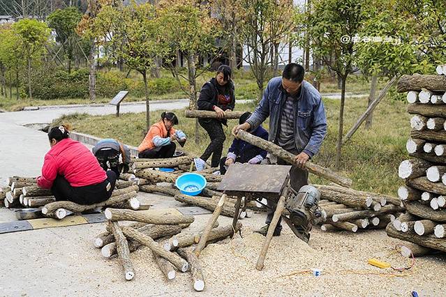 村民们正在给树桩打眼育种,呵,这小娃娃真棒,也能帮着妈妈干活了。