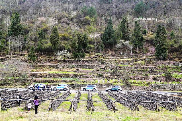 通江县三套车生态园的梅花开了,农民在鲜花盛开的农田里劳作。