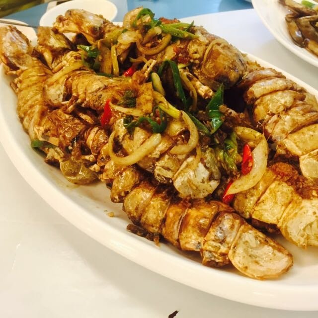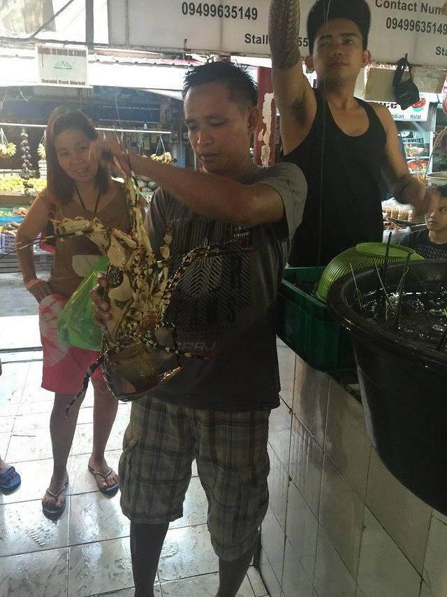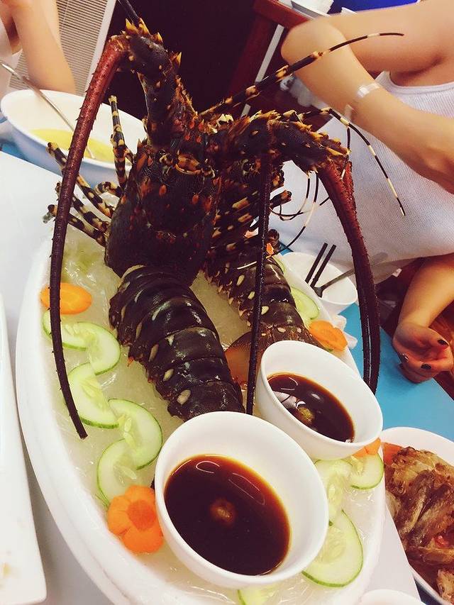 龙虾的开价都是按斤计算的,一般开价都在1800/斤,每只大概是3-6斤,谈的时候要按只来谈,然后谈到两只3600,前提是买其他的东西,于是我们说还要明虾和皮皮虾。