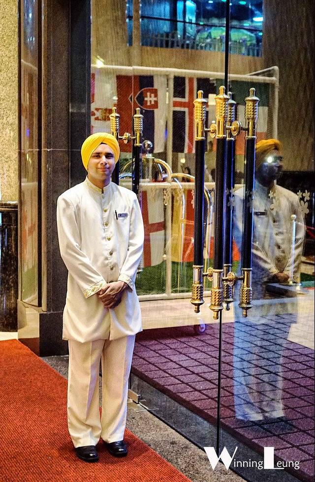 而酒店的大堂门口就更加富丽堂皇了,除了有帅气电瓶车师傅在随时候命外,印度门童也是一大亮点哟!