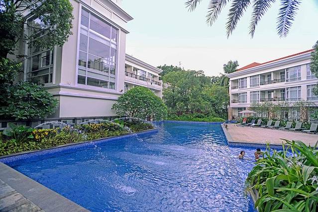 亲水区,顾名思义就是开窗一跳就能入水了。136间半山亲水区客房,设计新颖,如“水中楼阁”般环绕在泳池周围。310米超长泳道、3500平方米的碧波泳池,让您可以彻底享受更大的空间和更多的自然光线。