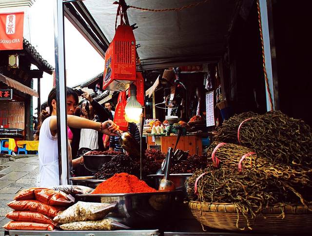 自由活动,走进青岩古镇。古镇里大街小巷错中复杂,道路两旁均是小商店,卖着各式各样的物品。