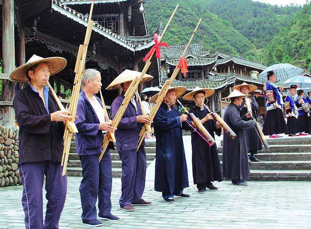 在大门前有一些苗族阿公吹着他们的乐器欢迎游客