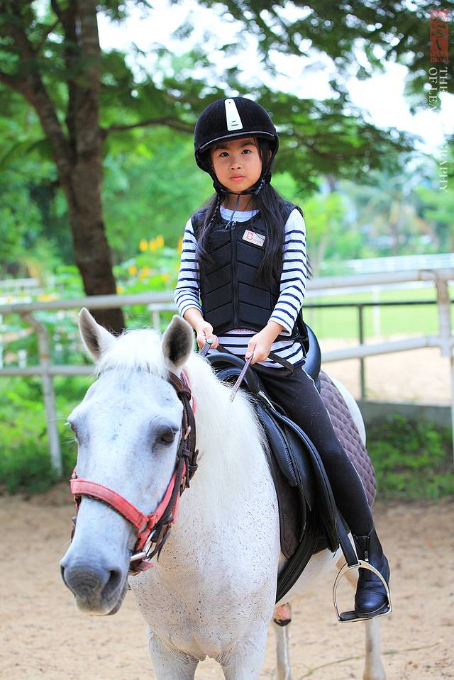 驿站专门为小朋友挑选了一匹白色的小马,看上去还是挺帅的。可能是紧张的缘故,我们家小妞上去后显得拘束,表情都僵硬了,这让为父有些担忧。