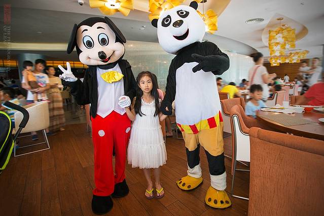 在用餐的过程中,出现了两个卡通人物,这下餐厅的小朋友开始沸腾起来了,都想要合影,对于小朋友来说这绝对比早饭更有吸引力。