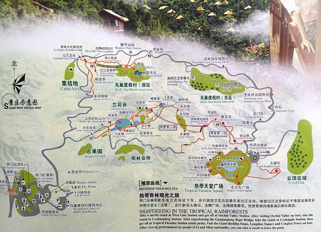 热带雨林观光之旅:西门站乘游览车至兰花谷站下车,步行游览兰花谷后乘车至过江龙站,体验过江龙索桥后于海棠站乘车至热带天堂站(主峰),步行参观大佛石、龙雕广场、沧海楼等景观,欣赏黎苗风情表演后乘车离园。