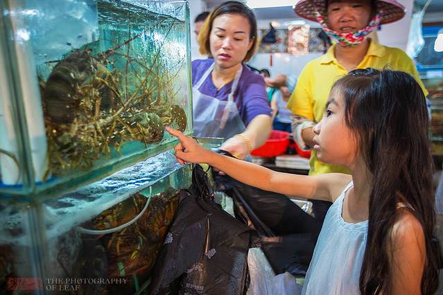 小朋友对这个龙虾特别感兴趣,看了又看还指着玻璃缸问这问那。还好大姐也热情,回答了一些问题。这个是大姐教我们如何识别野生龙虾和养殖龙虾,一定要看龙虾的肚子,肚皮饱满发白肉质肯定饱满、新鲜,又学到一招。