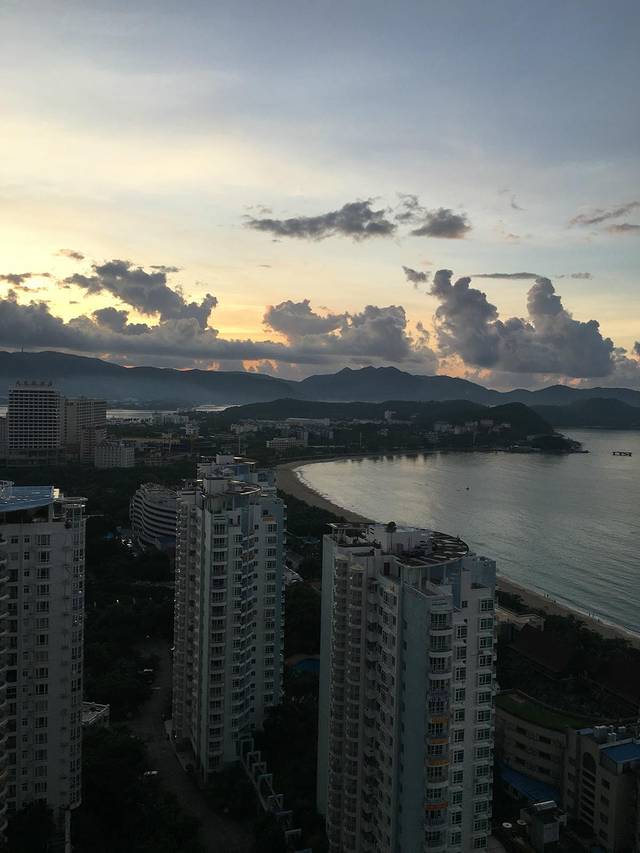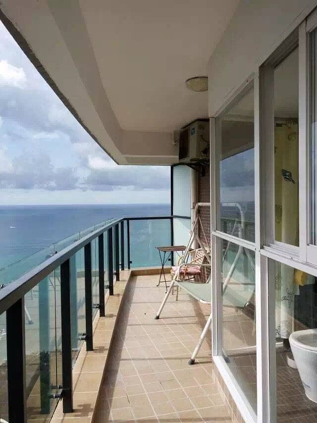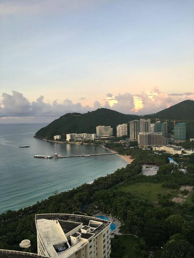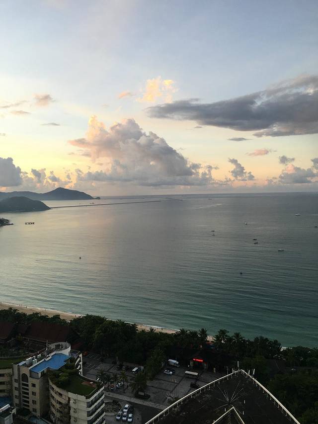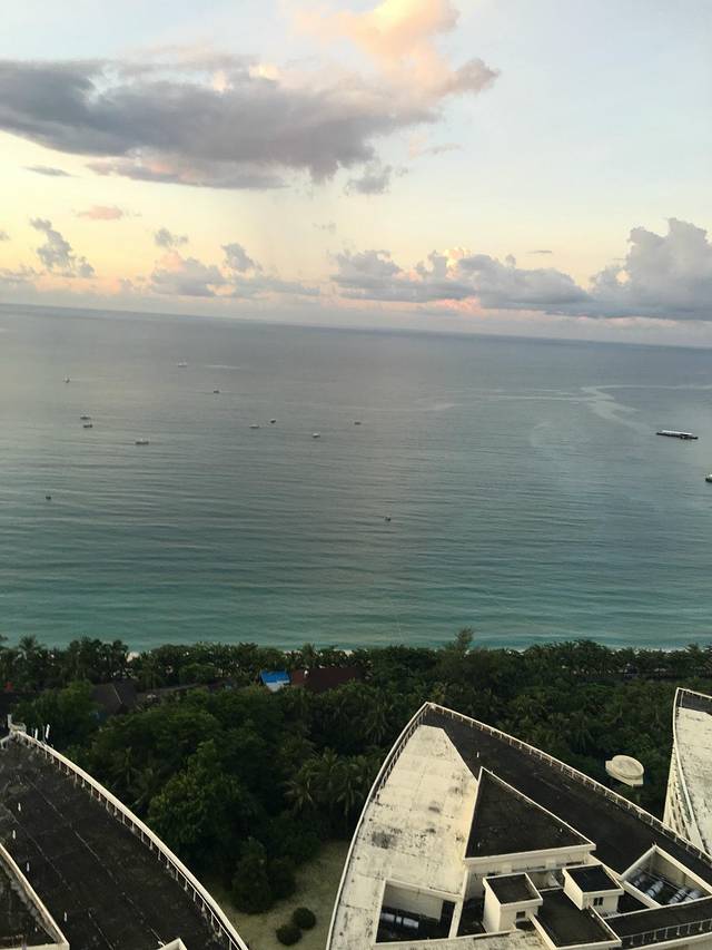 我们晚上7点的飞机,10点多三亚凤凰机场。我们下飞机之后选择了机场大巴到大东海,15元每人,原本我们是准备乘坐免费的摆渡车去汽车总站乘坐八路车,但是坐摆渡车的人太多所以我们选择了机场大巴。我们的酒店在大东海景区附近,酒店老板告诉我们在鹿岭路口下车,往大东海景点方向行走200米左右到海金茂海景花园(银泰酒店旁)。我们的酒店是一早就在晚上预定好的,我们两女孩子定的却是180度海景蜜月套房,哈哈