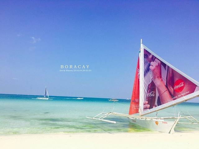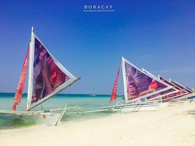 白天帆船都排排坐停靠在岸边,一个个“小三角”与碧海蓝天形成一幅美丽的图画,绘出了长滩岛的模样。