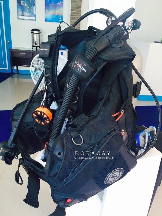 话说,这家潜店的装备完全都是SCUbapro的培训装备,气瓶也非常充足,一进到潜店就可以看到一整套装备摆设在桌子上,讲解基础知识的时候,也是用它的。